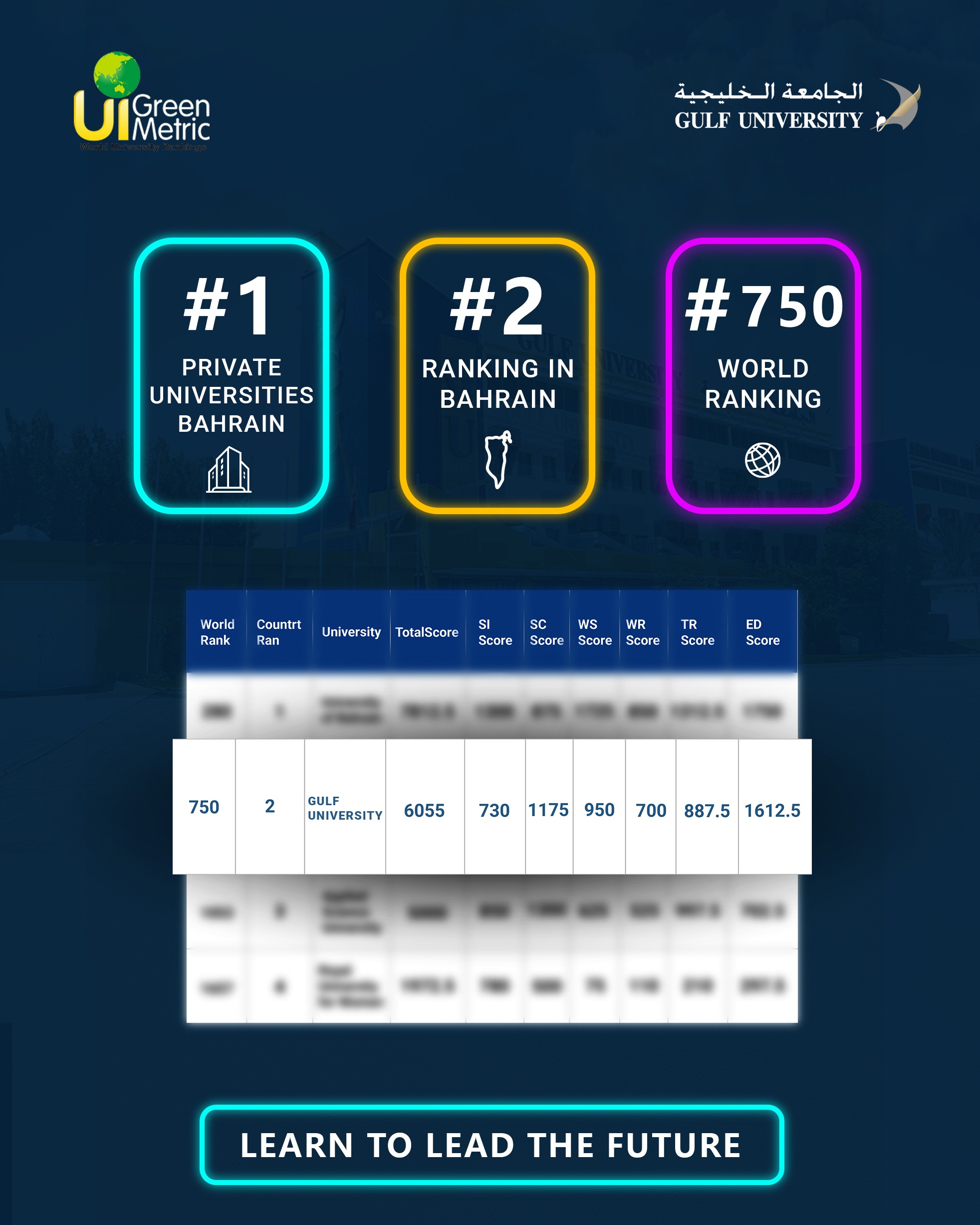 In the Kingdom of Bahrain, Gulf University secured the second position across all universities and the first position among private institutions. This achievement serves as a clear testament to its leadership in environmental sustainability and its advanced standing among higher education institutions both locally and regionally.